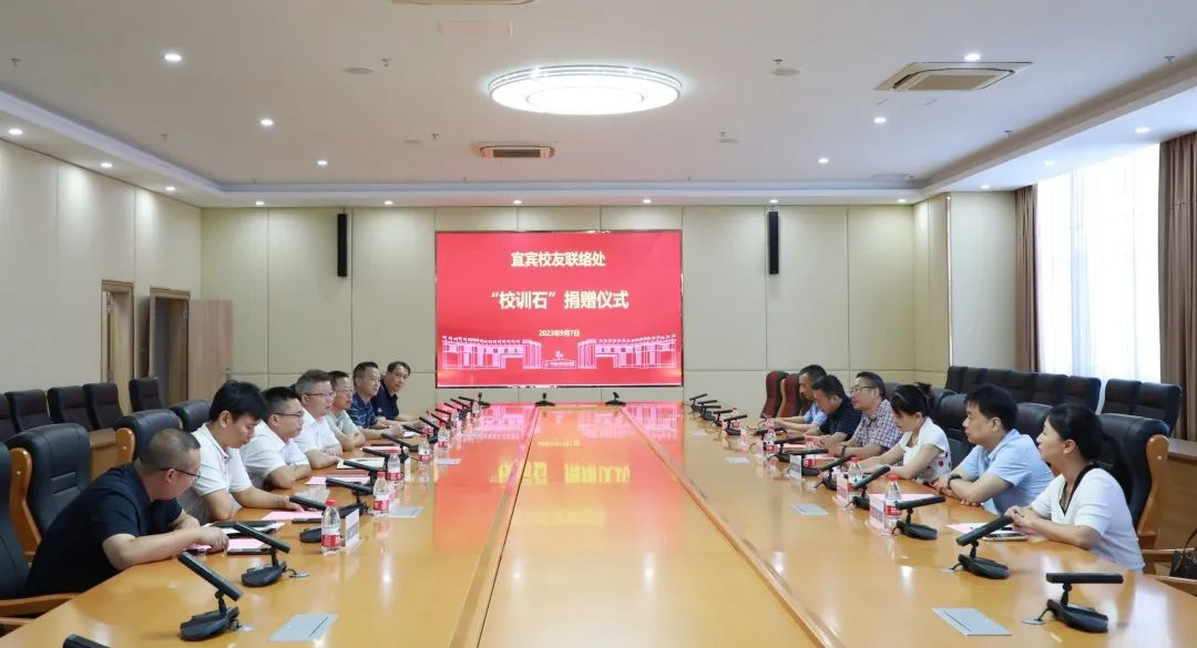 2023年9月7日上午,宜宾校友联络处“校训石”捐赠仪式在学校护国校区综合办公楼107会议室隆重举行。宜宾校友联络处顾问、宜宾天原集团营销总顾问(原无机38班校友)徐骏,宜宾校友联络处主任、宜宾天原集团管理创新总监(原分析49班校友)劳谦益,宜宾校友联络处副主任、宜宾天原集团营销管理总监(原分析49班校友)李涛,宜宾校友联络处副主任、宜宾天原集团国际贸易管理总监(原化机34班校友)冷波,学校党委副书记、院长文申柳,党委委员、副院长蒲开伦参加捐赠仪式。仪式由学校党委委员、副院长谢光杰主持。