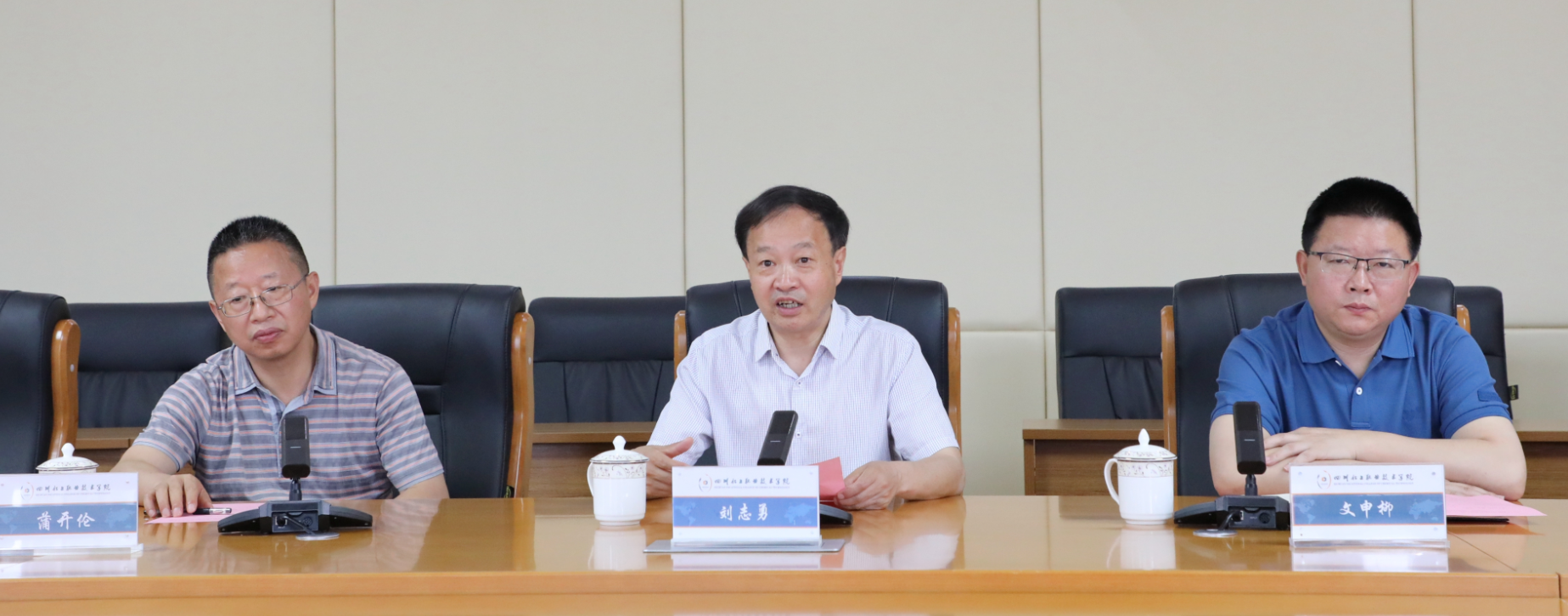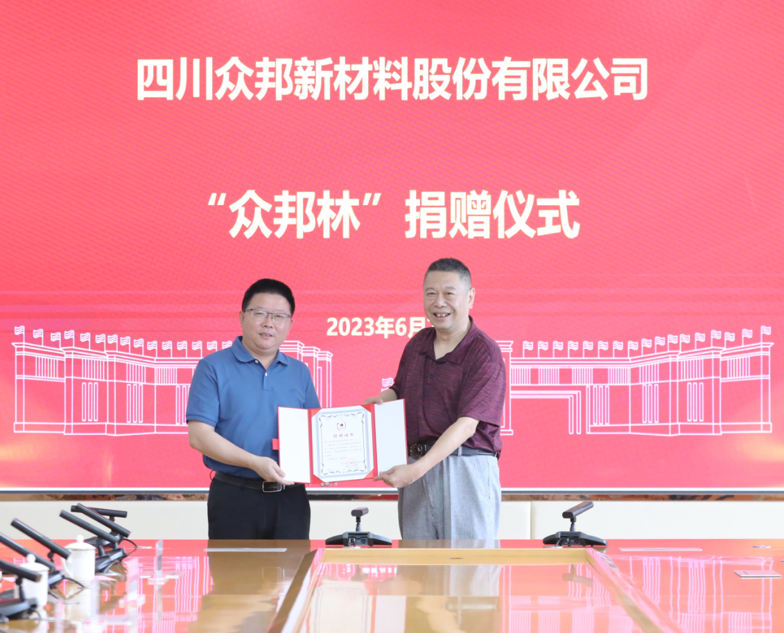 2023年6月7日上午,四川众邦新材料股份有限公司“众邦林”捐赠仪式在学校综合办公楼107会议室举行。四川众邦新材料股份有限公司董事长、总经理王军,副总经理、销售总监杜成,总经理助理王菁粟,学校党委书记刘志勇,党委副书记、院长文申柳,党委委员、副院长邓启华,谢光杰参加捐赠仪式。仪式由学校党委委员、副院长蒲开伦主持。