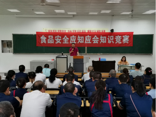 近日,由学校后勤服务处组织开展的食品安全应知应会知识现场竞赛,在学校综合实训楼A区208室举行。后勤服务处刘真如处长参加竞赛并讲话,后勤生活中心133名员工组成四个方队参加了现场知识竞赛。